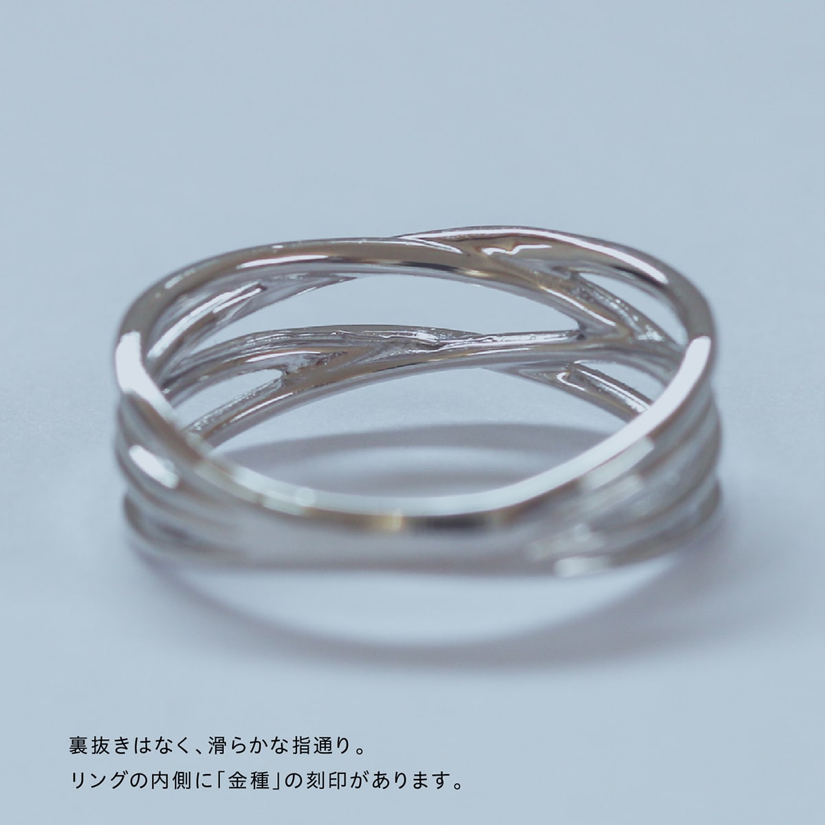 やわらかなラインがクロスしたレイヤードリング。着ける角度によってデザインに変化をつけられるので、見るたびに新鮮な印象を与えてくれます。細身のリングとの重ね付けはもちろん、ボリュームリングともコーディネートもおすすめ。使い方次第でカジュアルにもモードにもなる大人のための贅沢リング。品質を重視した繊細な日本の匠の技で創られた自信作(日本製)です。
