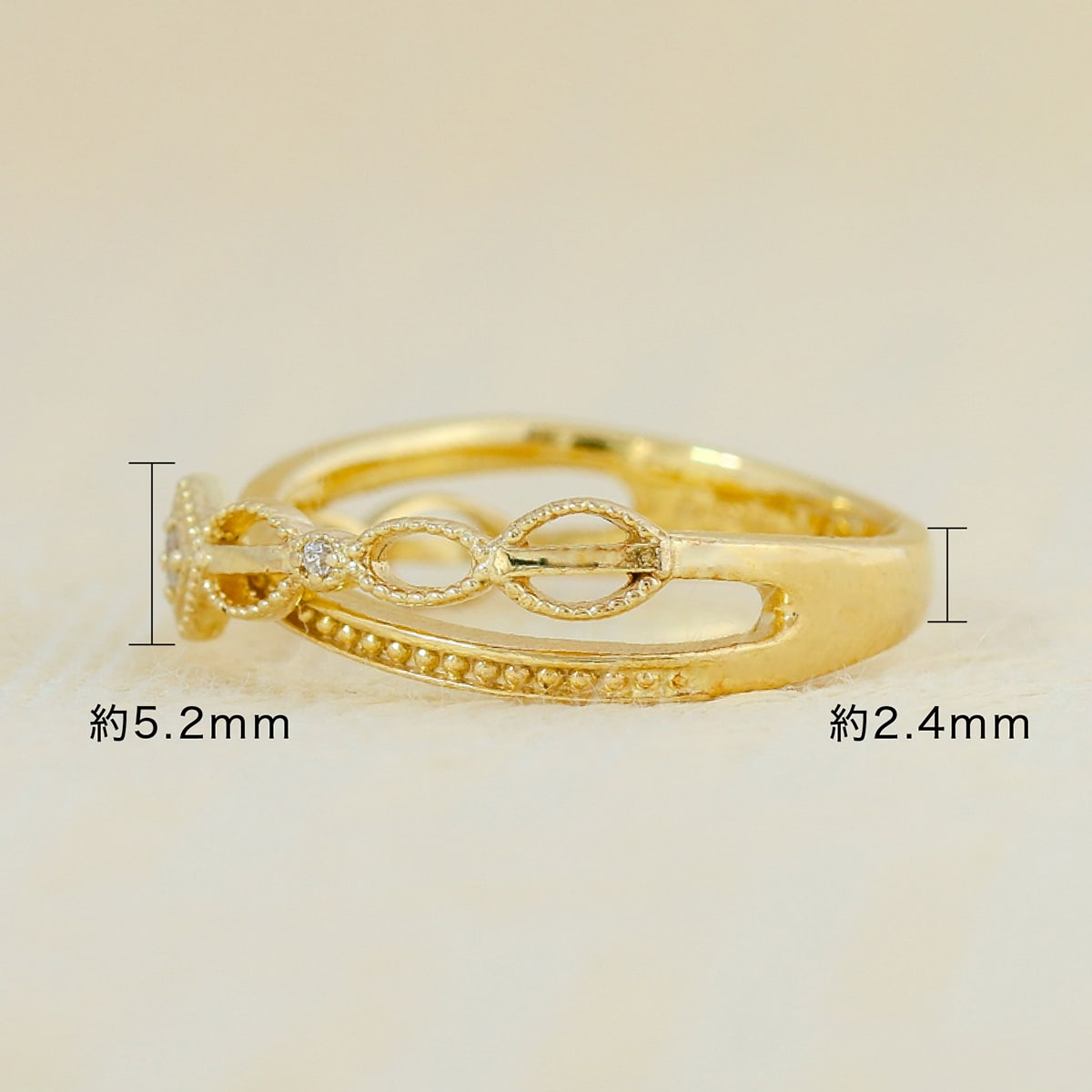 着け心地が良い確りとした作りのミル打ちを施した存在感のあるデザイン。これ一本で様になる存在感抜群の主役級リングです。洗練されたデザインで大人のお洒落を演出してくれます。シンプルながら高級感も持ち合わせた大人の女性のためのリングです。オンにもオフにも使いやすいので迷ったときはこれをチョイスして。程よいボリュームで存在感のある指輪です。その時の洋服によって可愛らしさやかっこよさに姿を変えるシンプルデザインリング。全体に厚みがあり確りとした作りの指輪になっていますので長くご愛用して頂けます。一本使いでも十分楽しめますが、今お持ちの指輪とのセットリング用としてもおすすめ。品質を重視した繊細な日本の匠の技で創られた自信作(日本製)です。4月の誕生石ダイヤモンド。