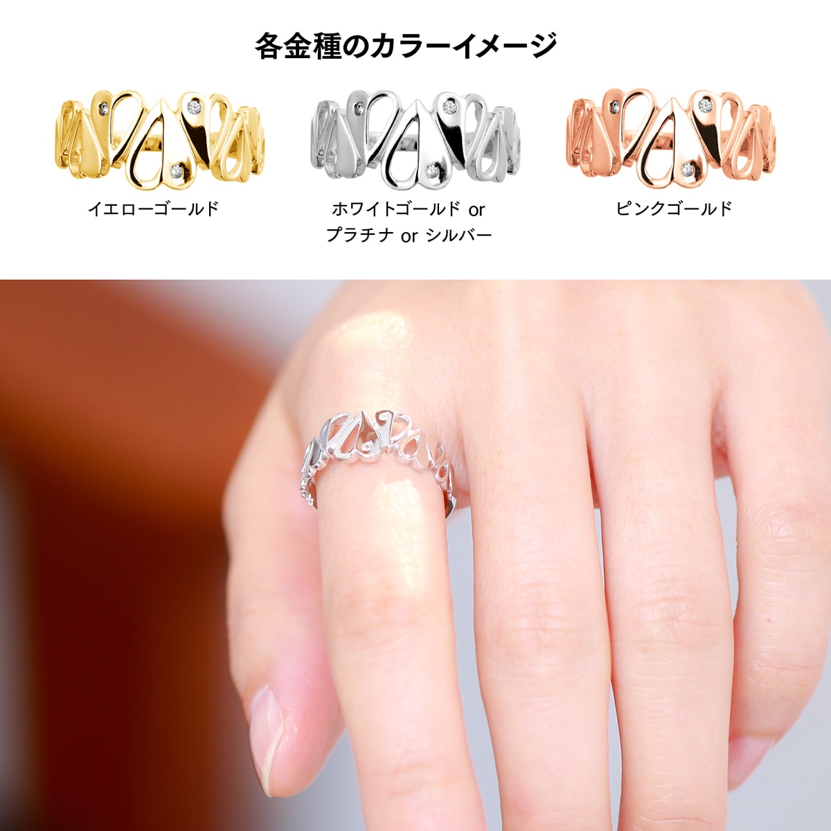 商品に金属名を打刻。またダイヤモンド付き商品にはカラット数も打刻してあります。