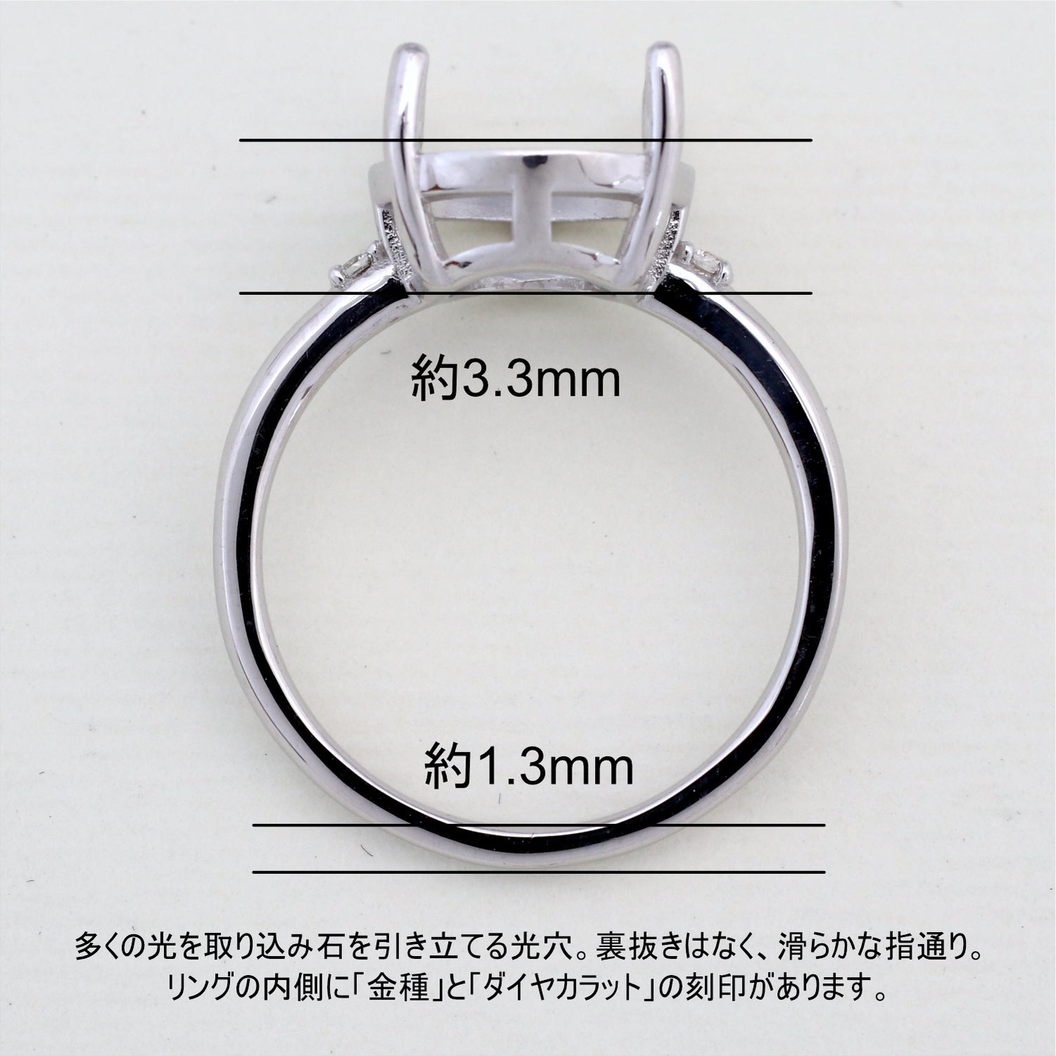 商品に金属名を打刻。またダイヤモンド付き商品にはカラット数も打刻してあります。