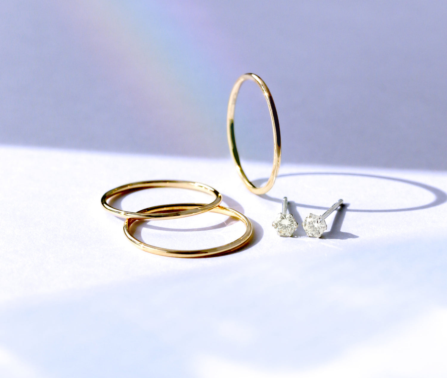 商品に金属名を打刻。またダイヤモンド付き商品にはカラット数も打刻してあります。