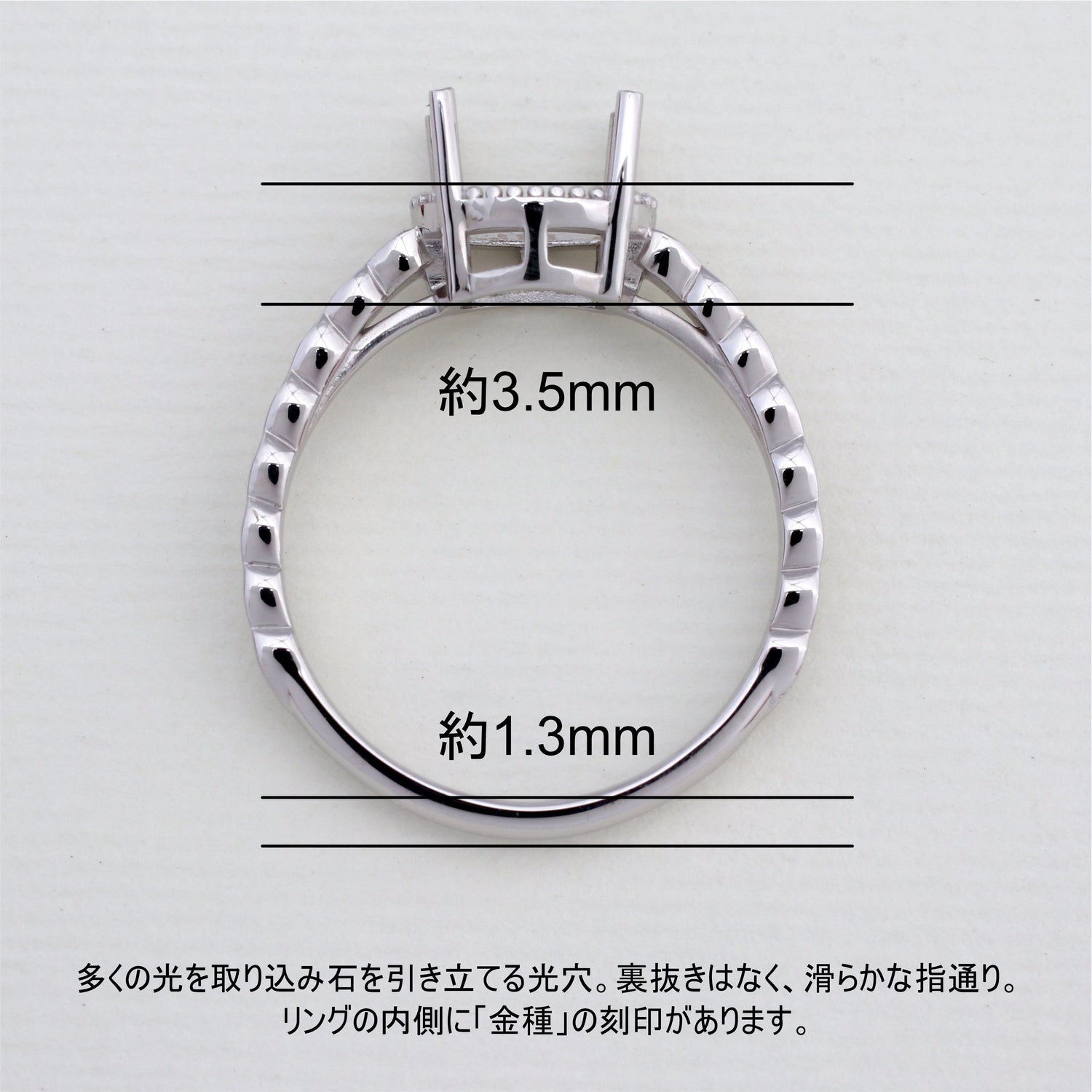 商品に金属名を打刻。またダイヤモンド付き商品にはカラット数も打刻してあります。