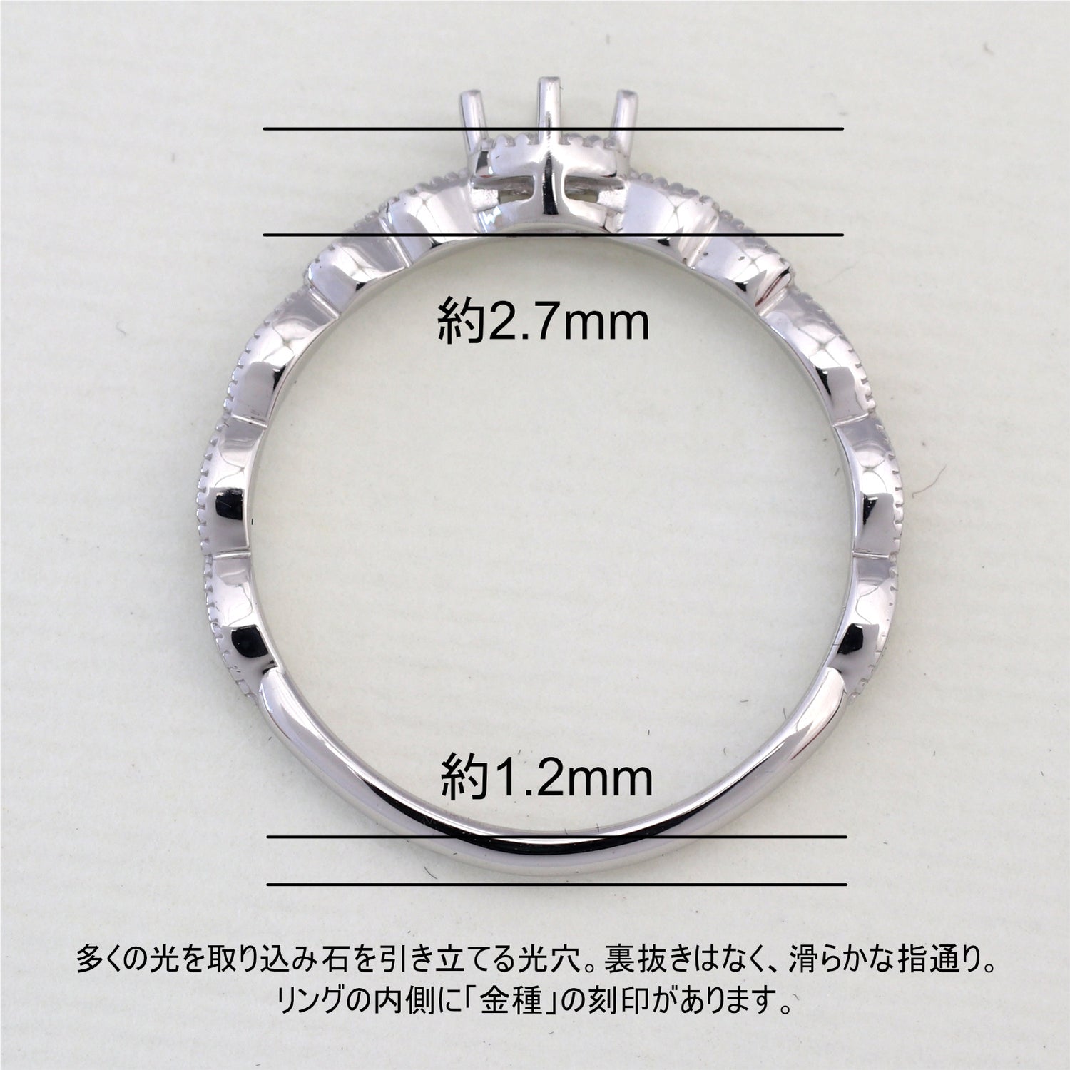 商品に金属名を打刻。またダイヤモンド付き商品にはカラット数も打刻してあります。