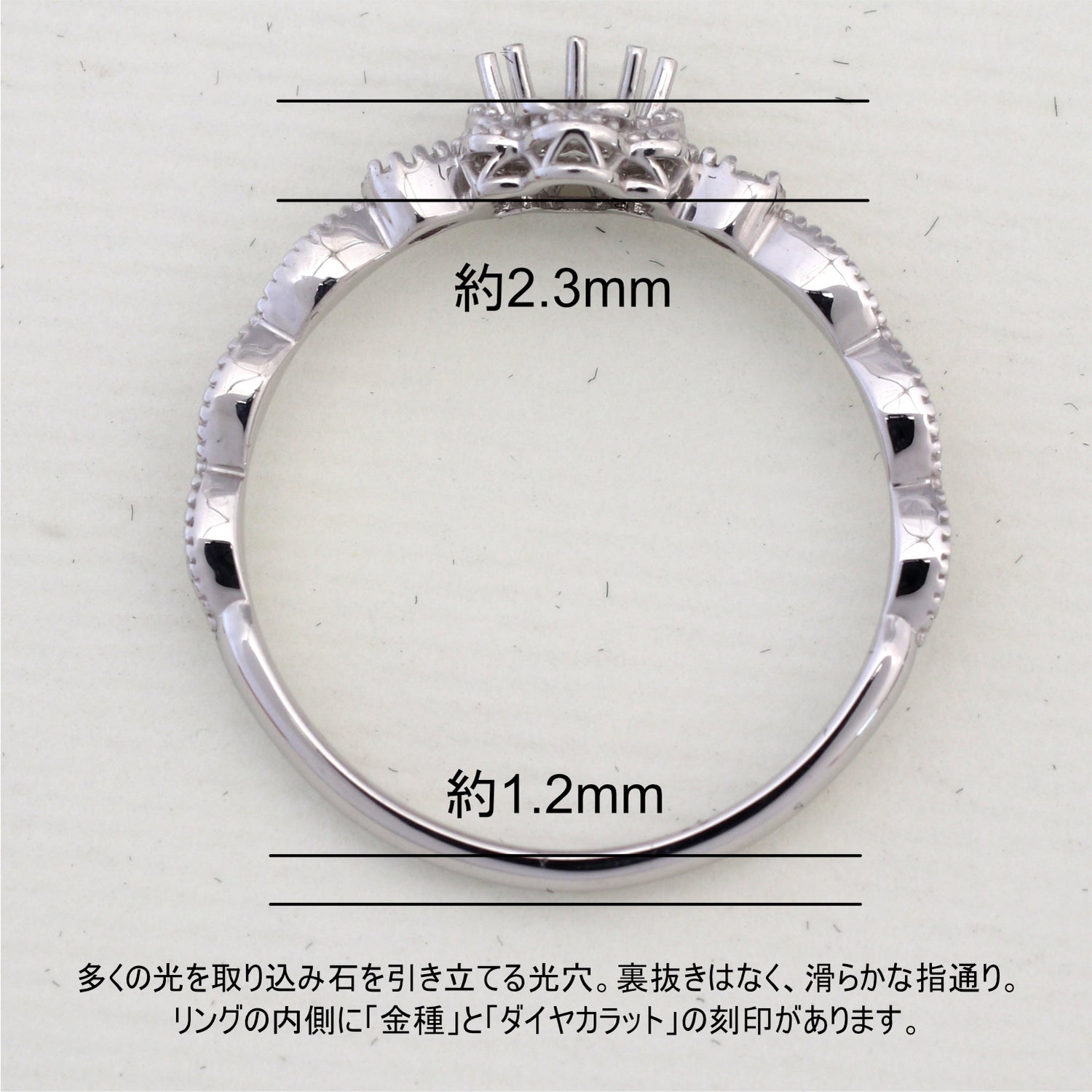 商品に金属名を打刻。またダイヤモンド付き商品にはカラット数も打刻してあります。