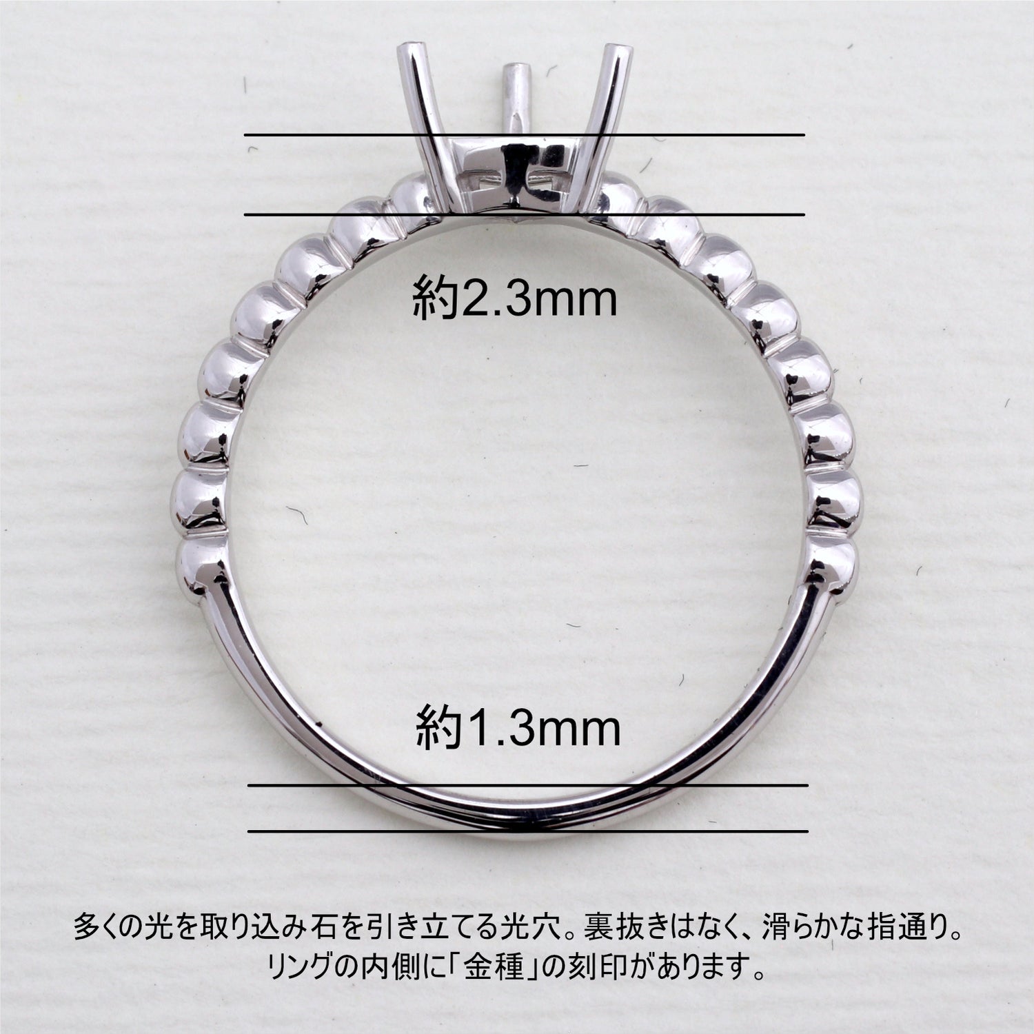 商品に金属名を打刻。またダイヤモンド付き商品にはカラット数も打刻してあります。