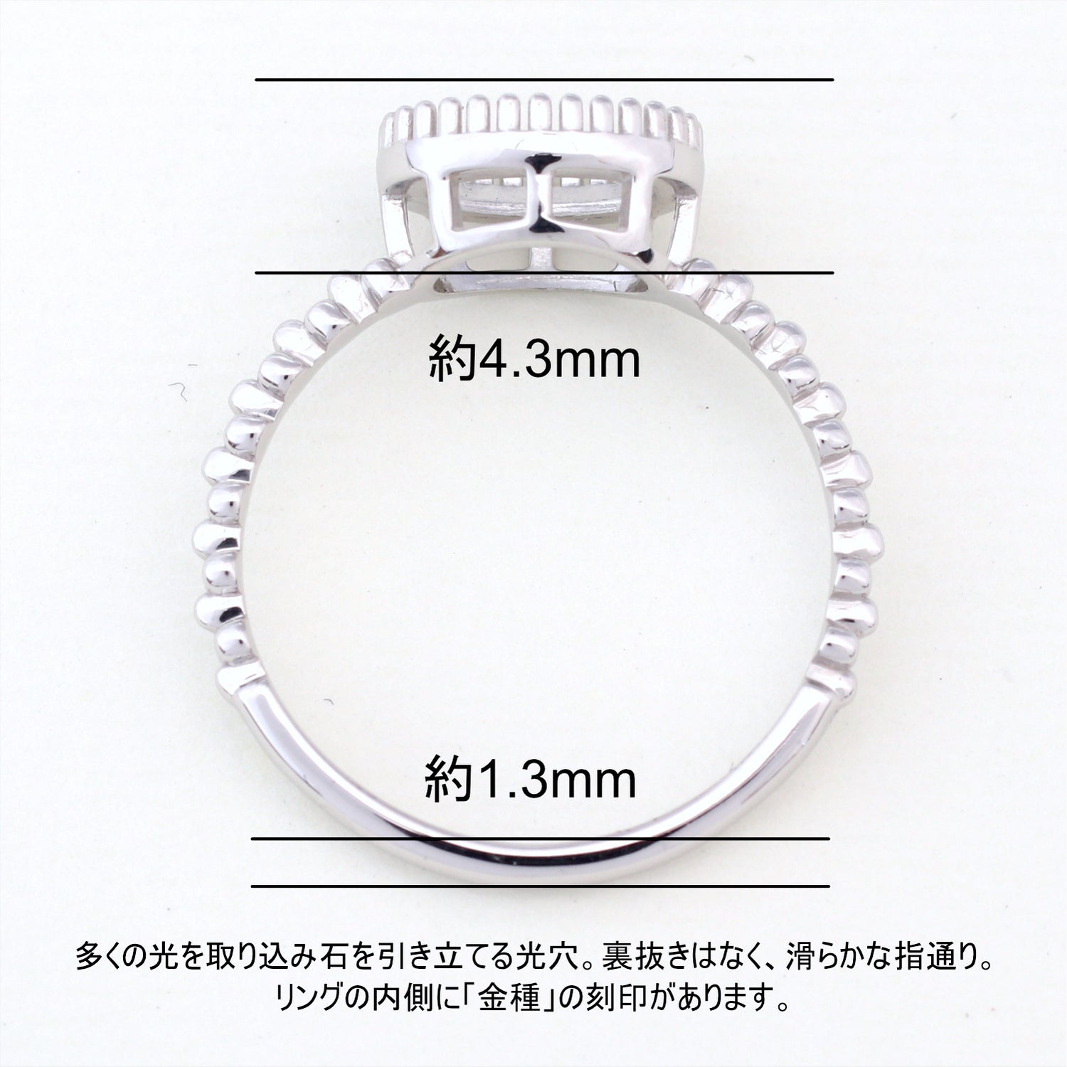 商品に金属名を打刻。またダイヤモンド付き商品にはカラット数も打刻してあります。