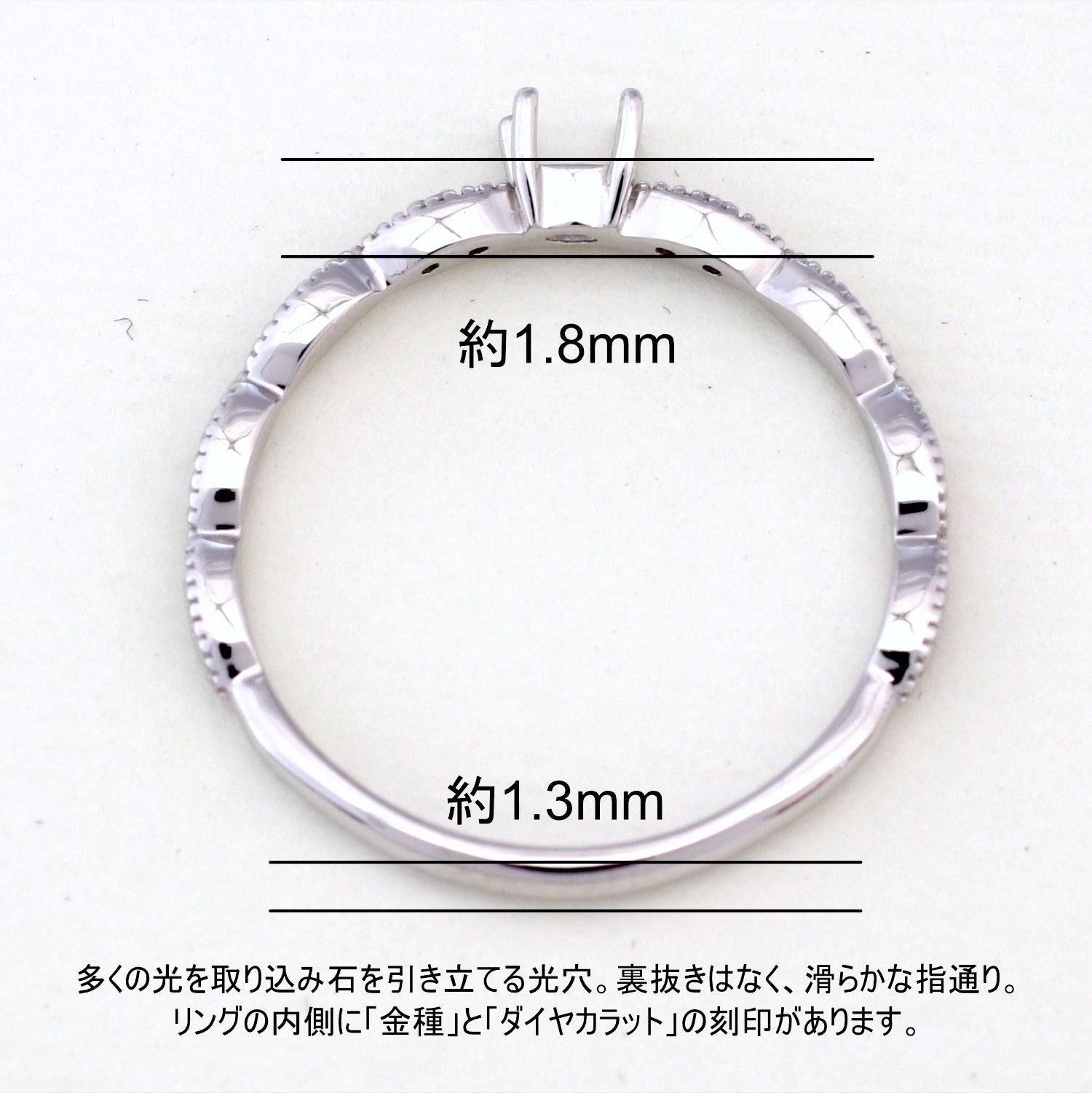商品に金属名を打刻。またダイヤモンド付き商品にはカラット数も打刻してあります。