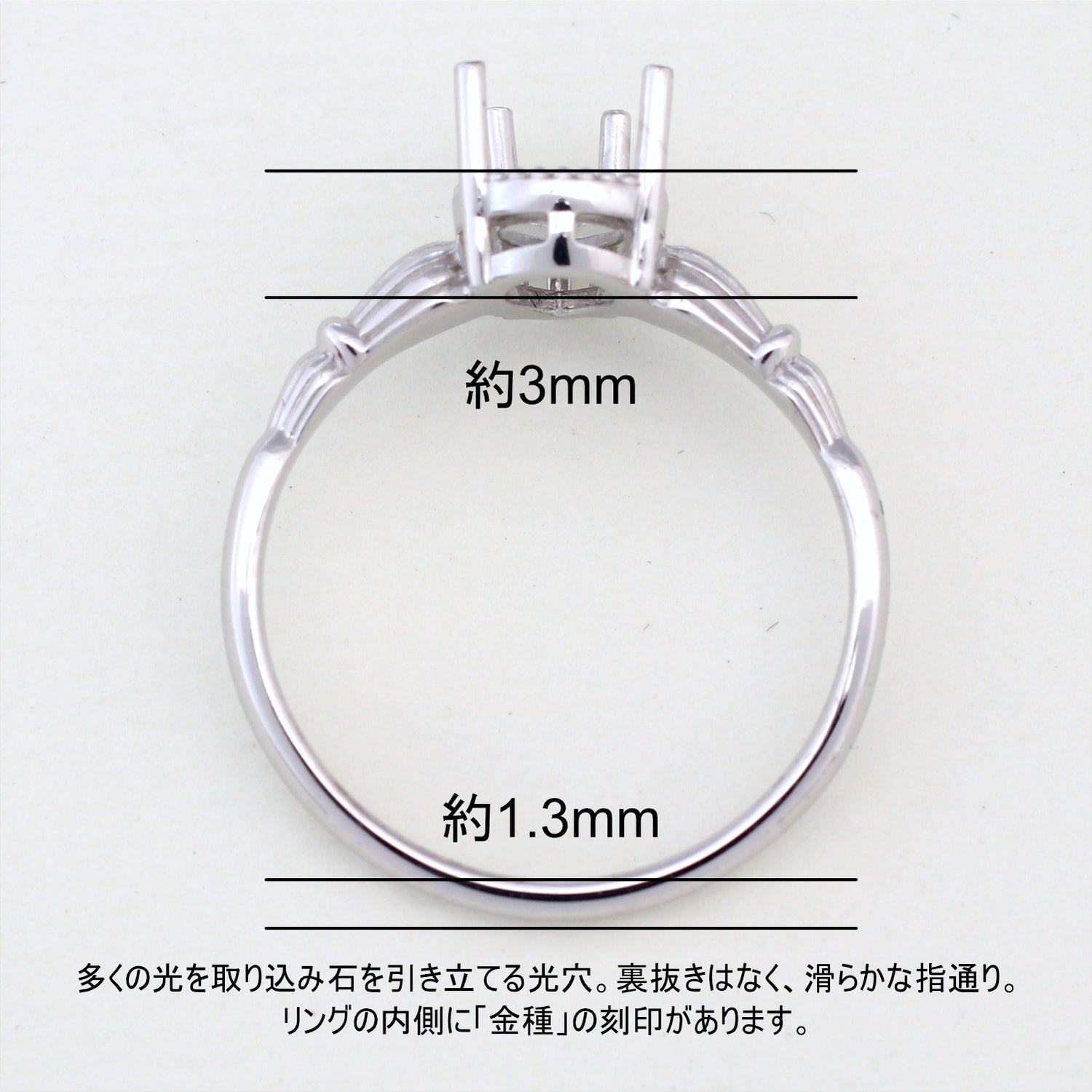 商品に金属名を打刻。またダイヤモンド付き商品にはカラット数も打刻してあります。