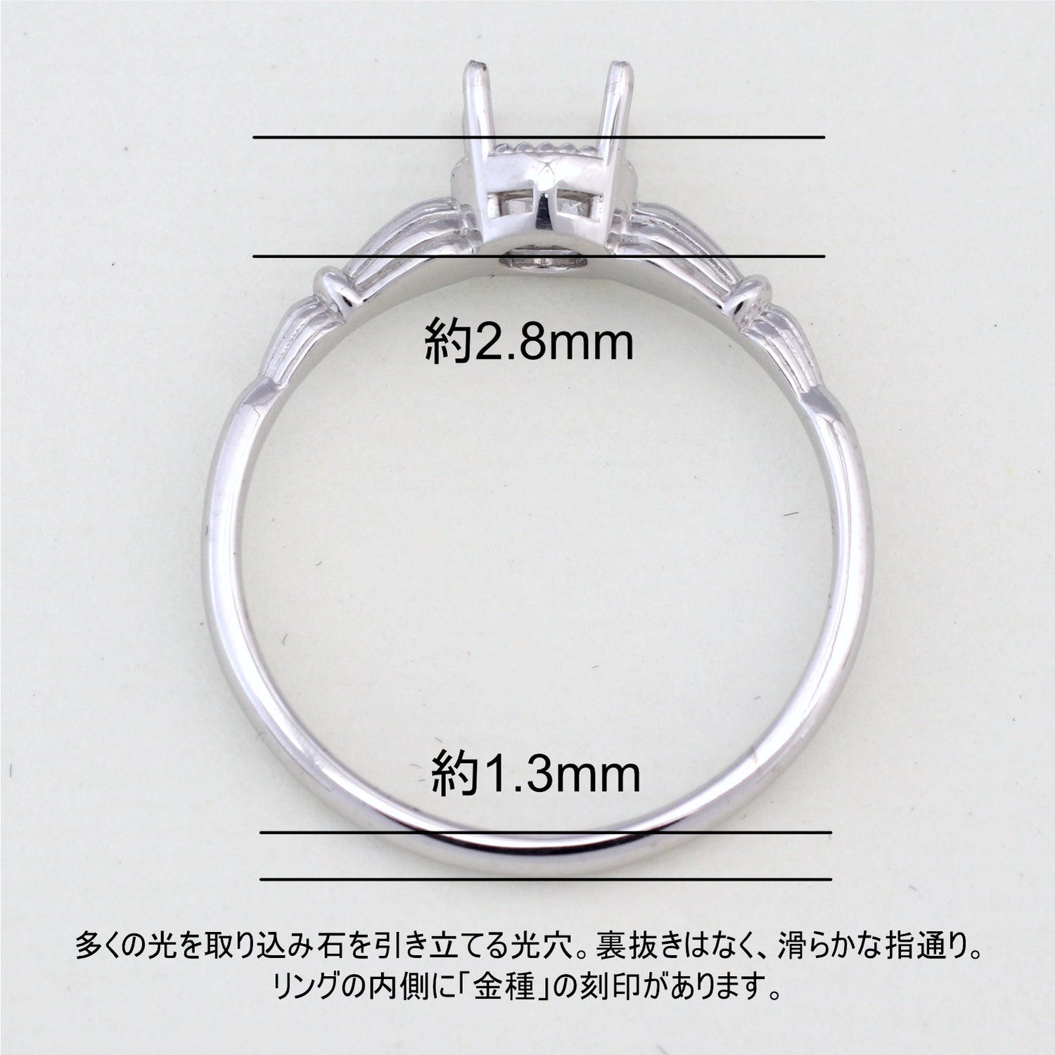 商品に金属名を打刻。またダイヤモンド付き商品にはカラット数も打刻してあります。