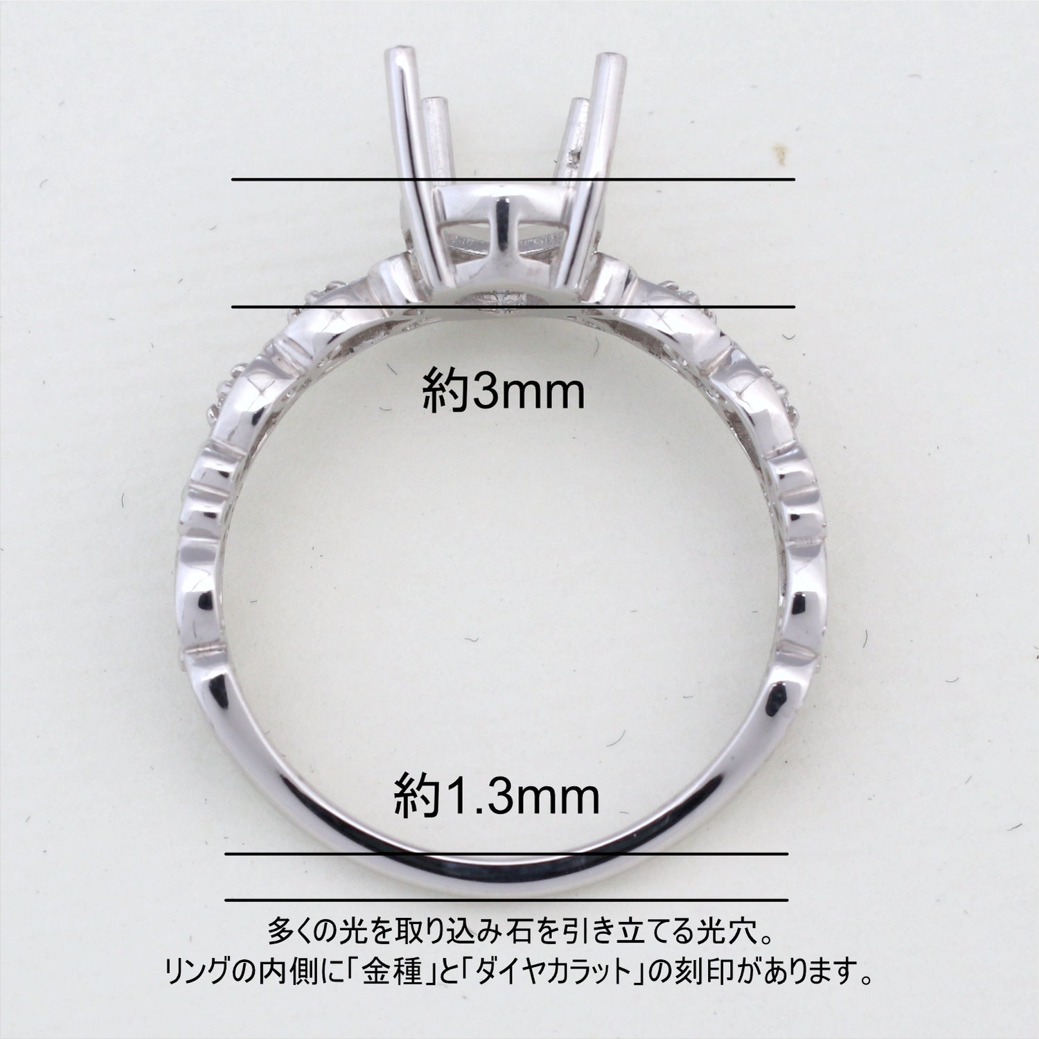 商品に金属名を打刻。またダイヤモンド付き商品にはカラット数も打刻してあります。