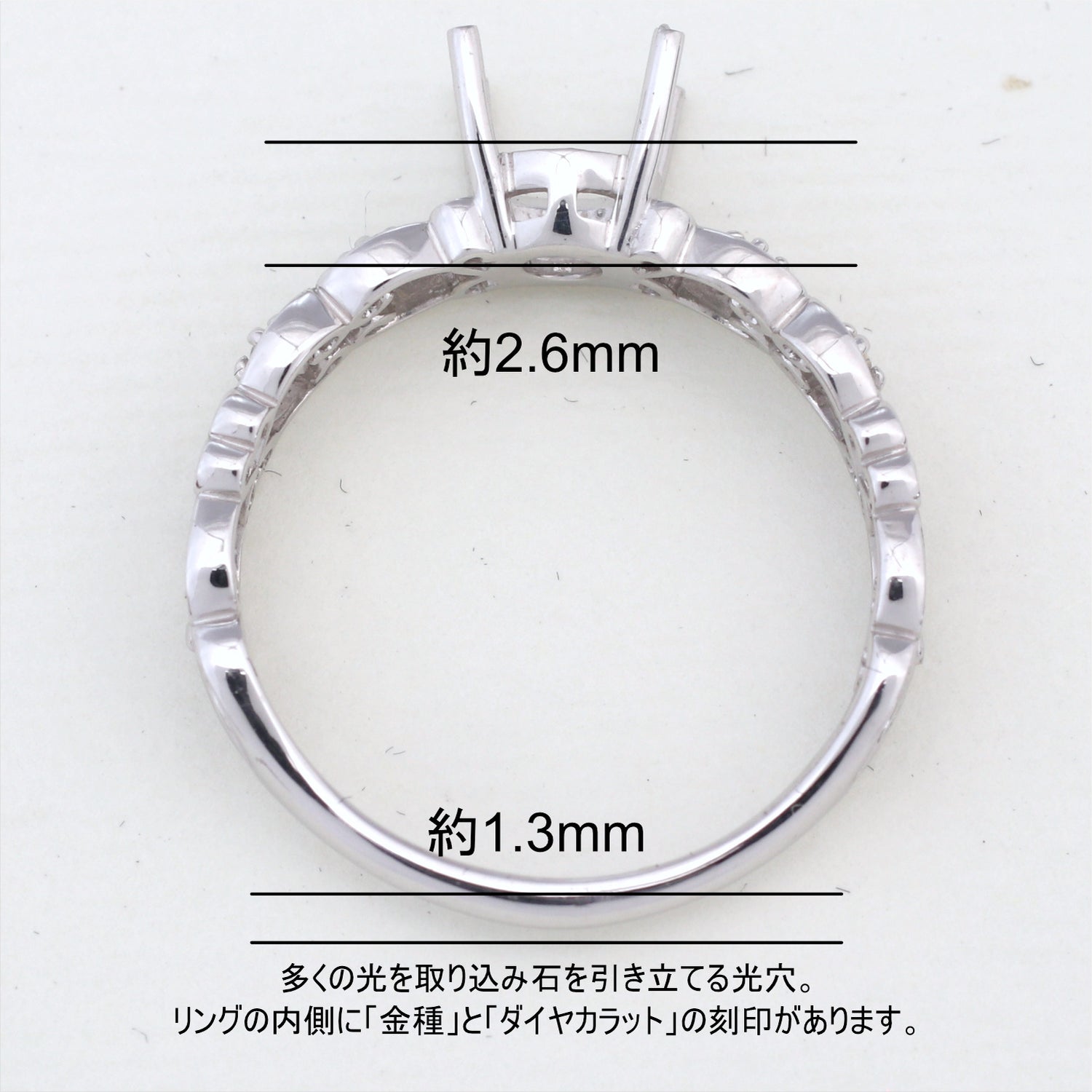 商品に金属名を打刻。またダイヤモンド付き商品にはカラット数も打刻してあります。