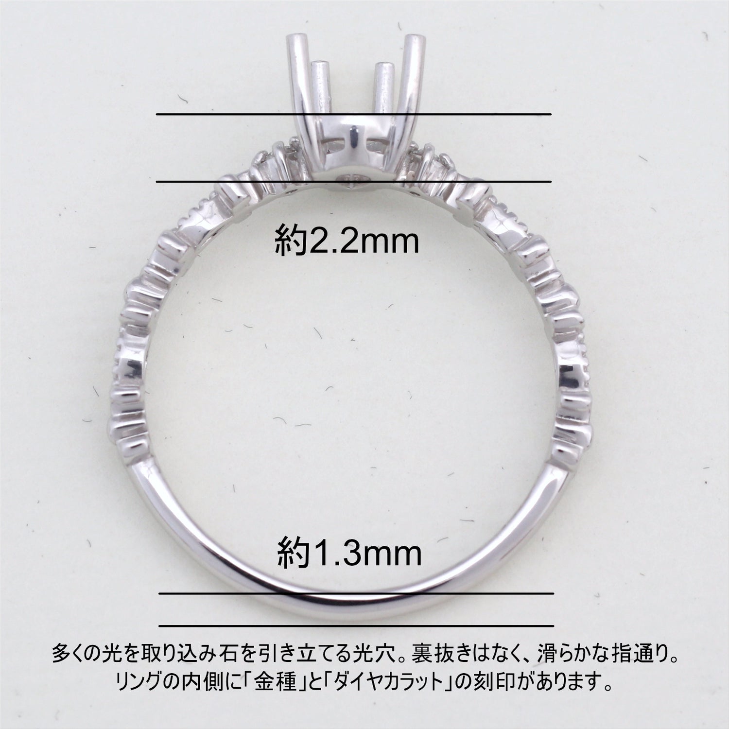 商品に金属名を打刻。またダイヤモンド付き商品にはカラット数も打刻してあります。