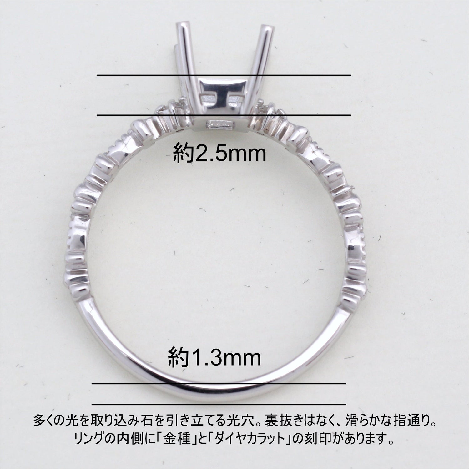 商品に金属名を打刻。またダイヤモンド付き商品にはカラット数も打刻してあります。