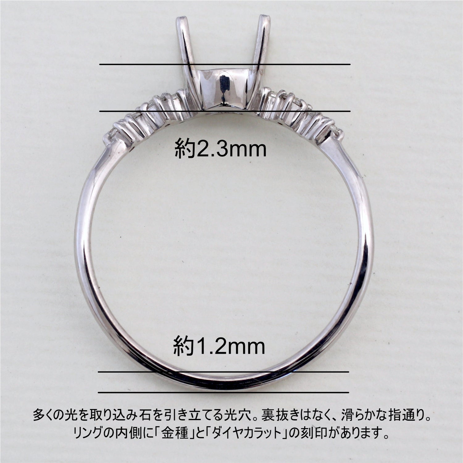 商品に金属名を打刻。またダイヤモンド付き商品にはカラット数も打刻してあります。