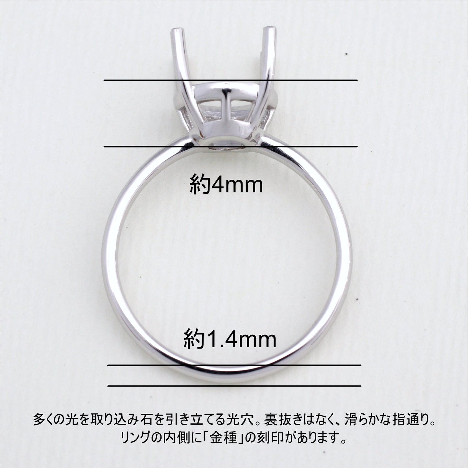 商品に金属名を打刻。またダイヤモンド付き商品にはカラット数も打刻してあります。